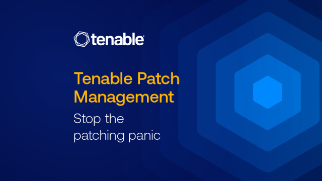 dark blue background with the Tenable logo and the words Tenable Patch Management: Stop the patching panic