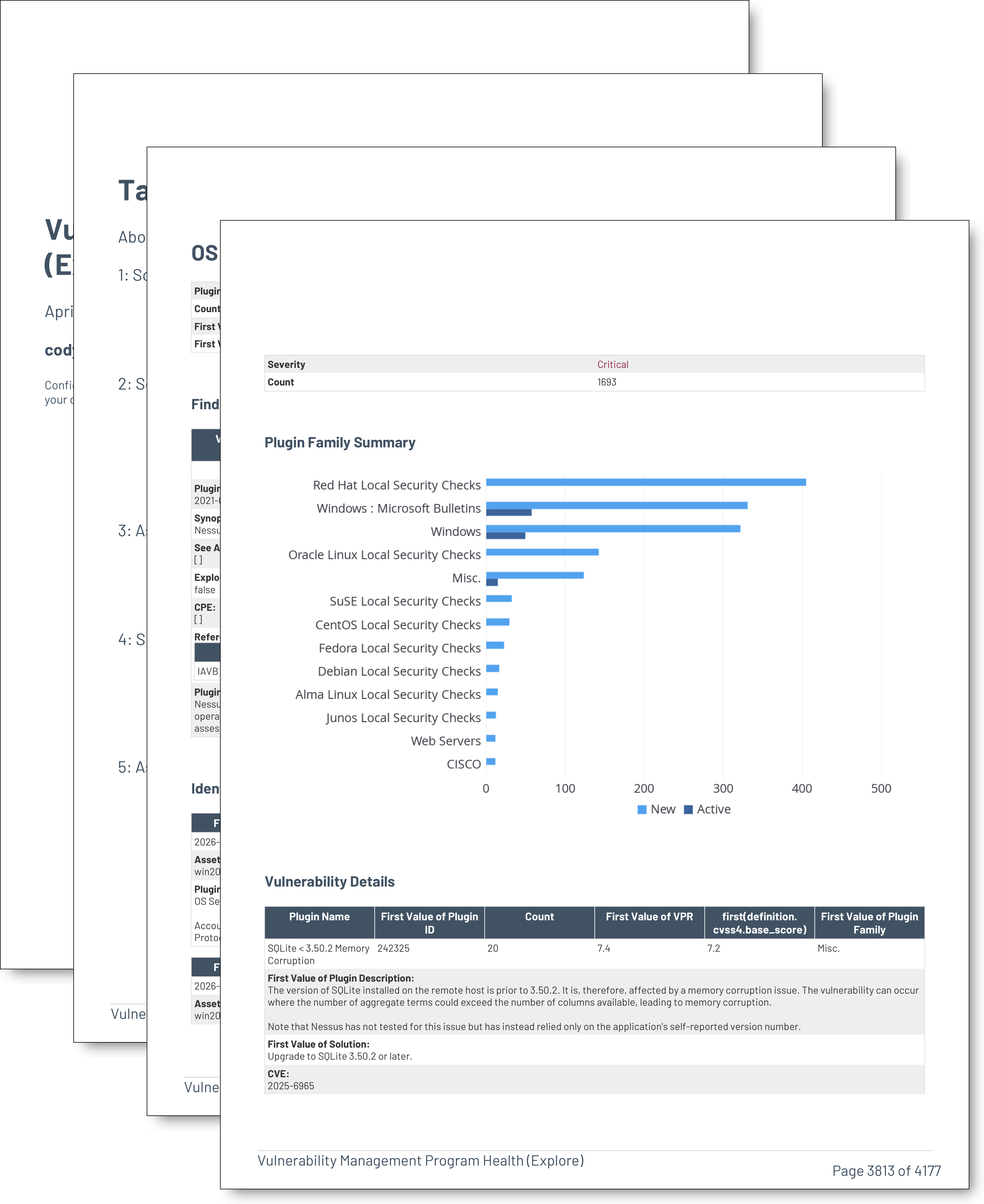 Organizations struggle to maintain comprehensive visibility across distributed infrastructure environments where assets continuously appear, evolve, and disappear without centralized tracking or validation. Security teams face mounting pressure to quantify and measure risk for diverse asset populations whose scanning status, authentication health, and vulnerability profiles remain fragmented. Additionally the team must reconcile conflicting asset inventories, credential failures, and incomplete scan coverage that impacts an accurate risk assessment. This report helps to unify asset discovery data, scan authentication indicators, and vulnerability detection results into a single report, allowing for the planning and execution of remediation actions.